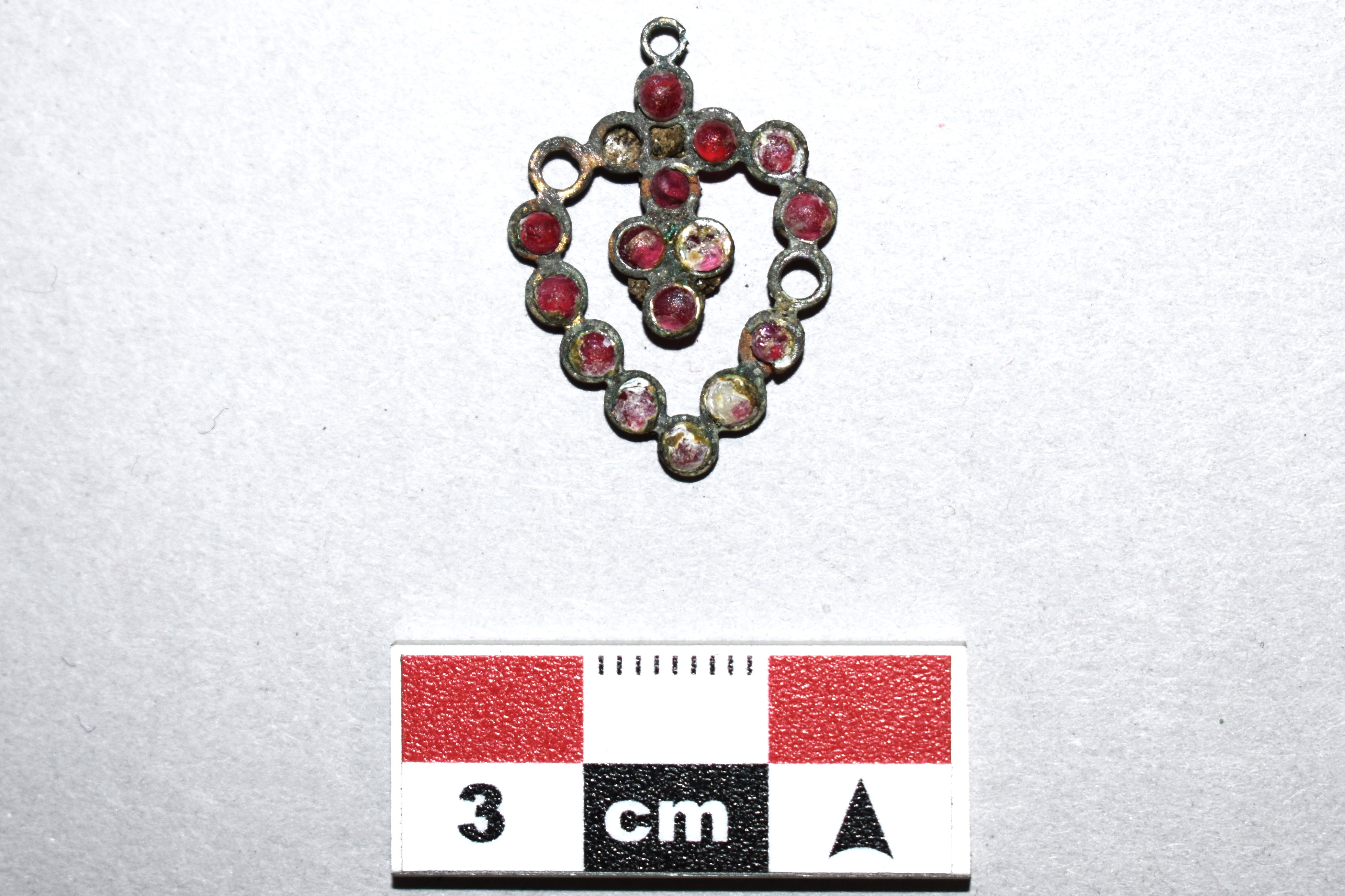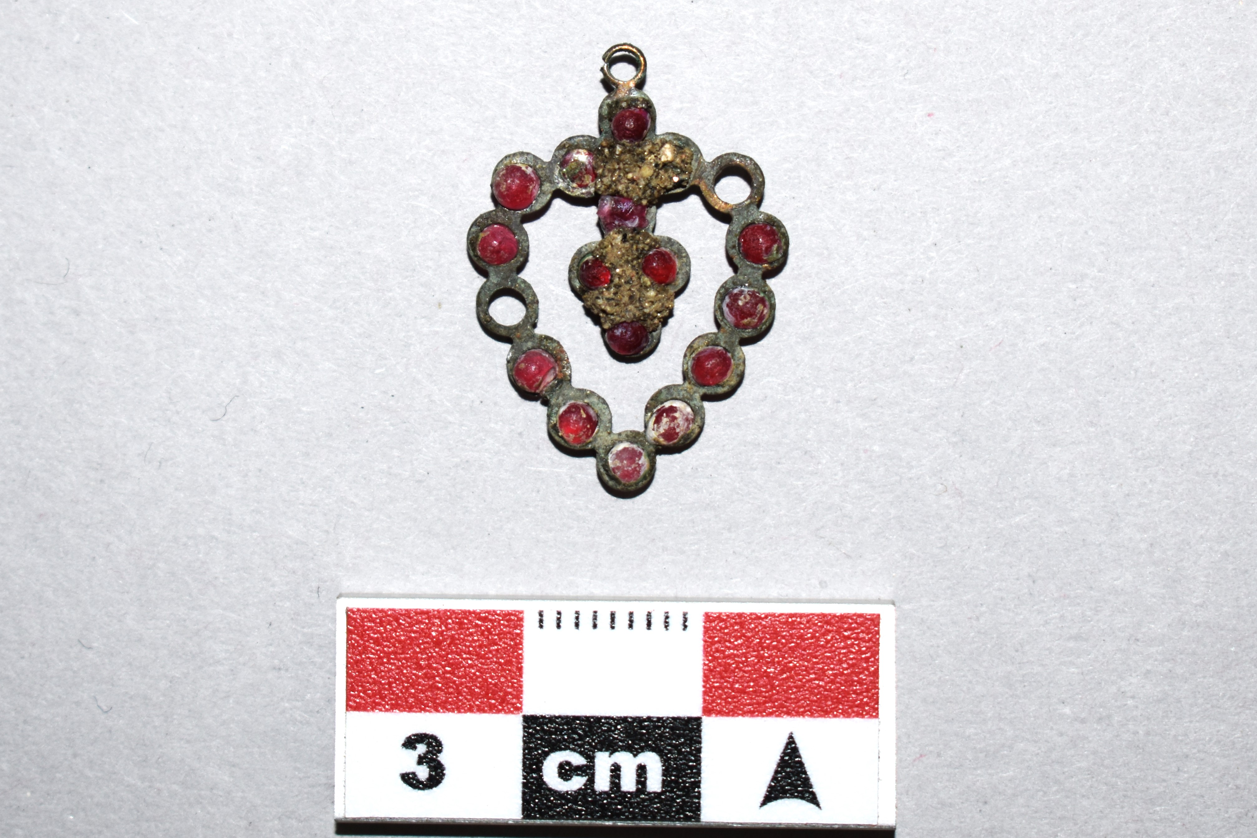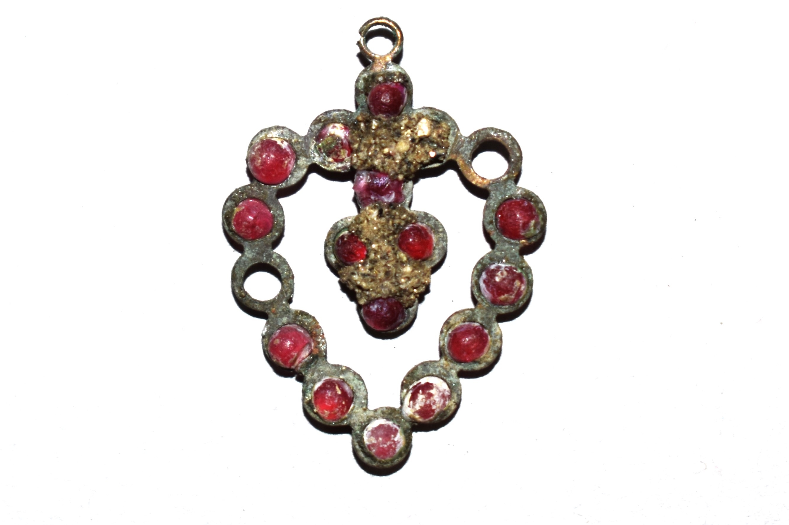 Objeto decorativo de uso personal. Pieza con forma de corazón con un pequeño corazon en interior.Objeto compuesto de soportes metálicos para piedrería que conforman la pieza con incrustaciones rojas. Presenta 18 orificios para inscrustaciones de los cuales 3 son faltantes.