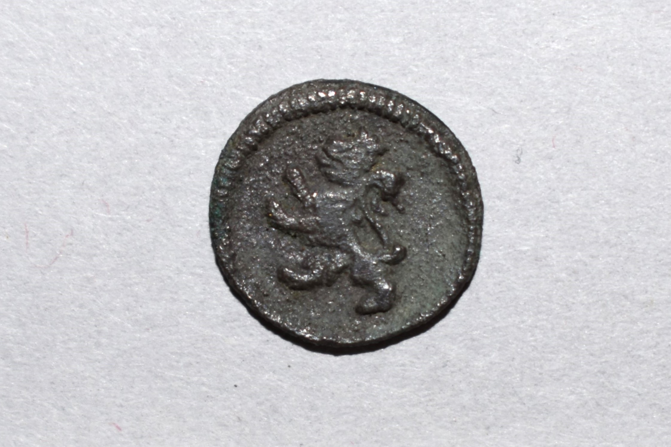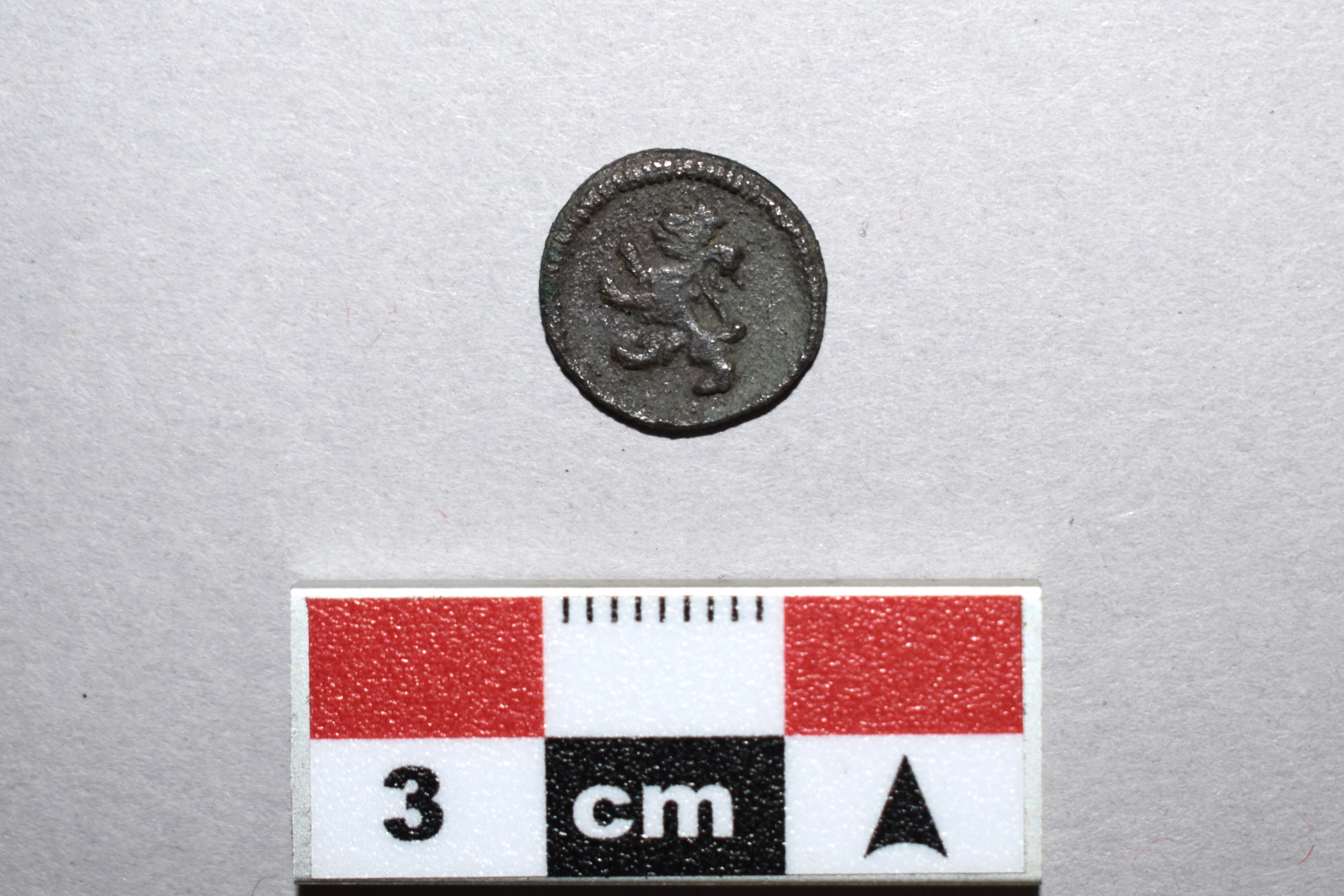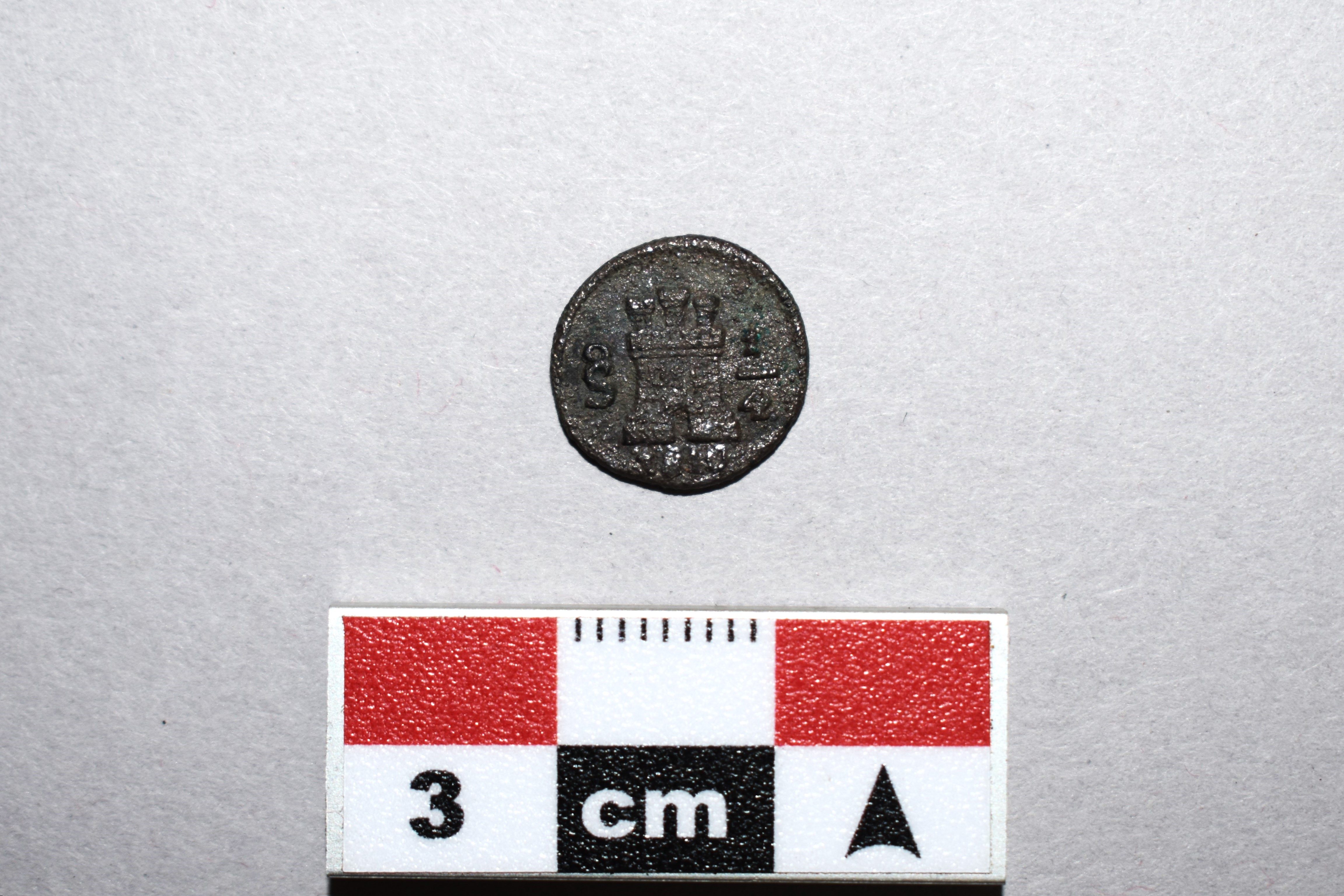 Objeto acuñado. Cuerpo plano y circular. Pieza referente a 1/4 de real . En cara frontal presenta como centro una figura de fortaleza, a la izquierda una figura en forma de S y a la derecha el gravado de 1/4, bajo la fortaleza se aprecia la fecha 1810. En la cara posterior presenta el escudo de un león.