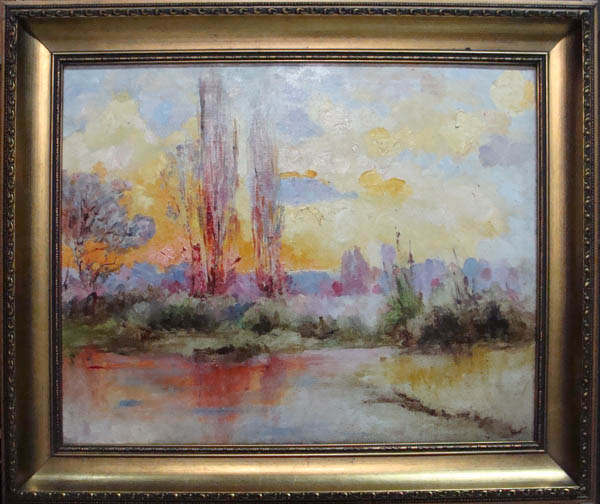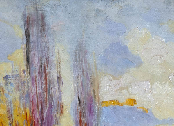 Obra rectangular, orientación horizontal. Paisaje de campo con la línea del horizonte en el tercio inferior de la obra. Vista de campo al atardecer, primer plano con espejo de agua, en segundo plano línea de arbustos bajos y tres álamos en la mitad izquierda, uno de copa frondosa y dos altos álamos en tono rojo. Cielo con nubes en tono amarillo y azul claro.